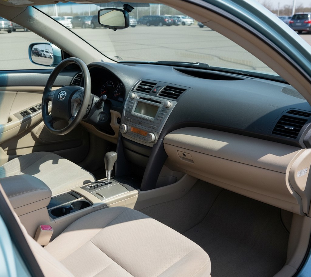 The 2009 Camry LE features a 2.4-liter, 158-horsepower four-cylinder engine with VVT-i, front-wheel drive, and an optional 5-speed automatic transmission. It comes standard with anti-lock brakes and front-seat side and full-length side curtain airbags. The car has a 18.5-gallon fuel tank, with an estimated fuel economy of 21 MPG city and 31 MPG highway.